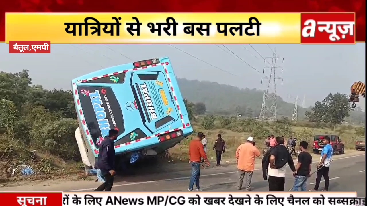 बैतूल में यात्रियों से भरी बस पलटी हादसे के समय बस में 32 यात्री सवार थे।