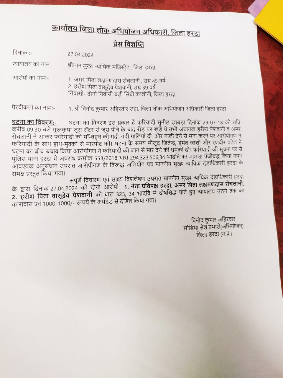 Harda_ CJM court on Saturday punished two people including Leader of Opposition Municipality Harda Amar Rochlani with imprisonment till the court rises and a fine of Rs 1000 each. District Public Prosecutor Officer Vinod Kumar Ahirwar said that on the night of 29th July 2018, around 3.30 At 9 o’clock the complainant Sunil Chhabra was standing on the road near the Juice Center near Badi Sindhi Colony. From here, Harish’s father Vasudev Peshwani (39) and Amar’s father Laxmandas Rochalani came. They abused and beat him. Jitendra, Hemant Joshi and Ranveer Patel intervened. Both of them threatened to kill Sunil Chhabra and left from there. On the report of complainant Sunil Chhabra, a case under section 294,323,506,34 was registered against both of them in the city police station.