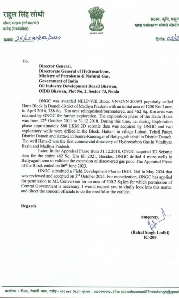 #दमोह_संसदीय_क्षेत्र की हटा विधानसभा में ONGC को 462 स्क्वेयर किलोमीटर में मिले गैस भंडार के संबंध में मध्यप्रदेश शासन की और से सभी अनुमतियाँ मिलने के उपरांत प्रस्ताव DGH की अनुमति के लिए लंबित है।