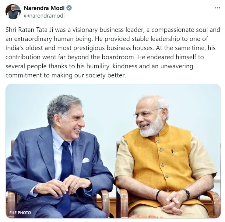 निधन की जानकारी उद्योगपति हर्ष गोयनका ने सबसे पहले दी। उन्होंने रात 11:24 बजे सोशल मीडिया पर लिखा, ‘घड़ी की टिक-टिक बंद हो गई। टाइटन नहीं रहे। रतन टाटा ईमानदारी, नैतिक नेतृत्व और परोपकार के प्रतीक थे।’