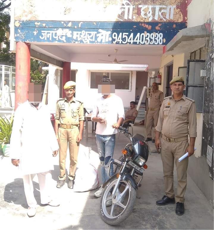 थाना छाता पुलिस द्वारा बुधवार को एनएच 19 के किनारे दौताना फ्लाईओवर से पहले दौताना सर्विस रोड पर देशी शराब के साथ दो लोगो को गिरफ्तार किया गया वही गिरफ्तार अभियुक्त साहिद पुत्र बल्लो निवासी गाँव सारन एनआईटी तहसील बडखल थाना सारन जिला फरीदाबाद (हरियाणा) व अख्तर पुत्र सामलिया निवासी दौताना थाना व तहसील छाता जिला मथुरा के रहने वाले हैं वही इनके कब्जे से 100 पव्वे अवैध देशी शराब हरियाणा मस्ताना मार्का व एक मोटर साइकिल संख्या HR87F1716 हीरो स्पलेन्डर प्लस को भी बरामद किया ।